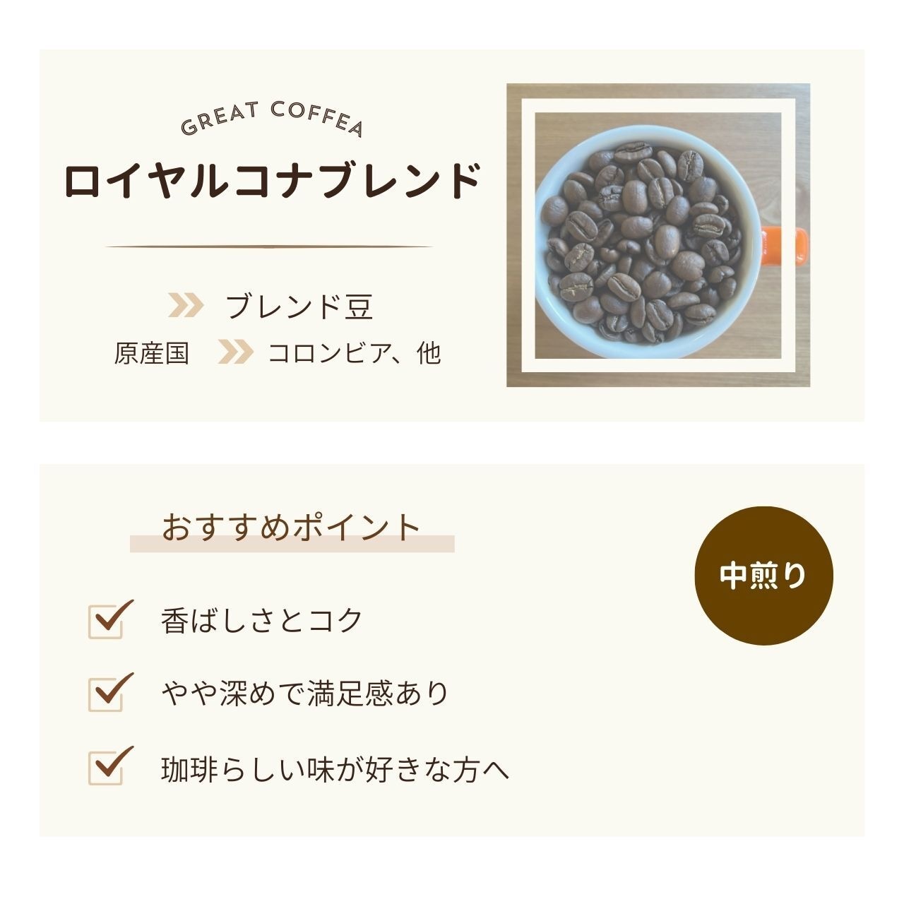 香ばしさとコクをしっかり楽しめる、やや深めのブレンド。
