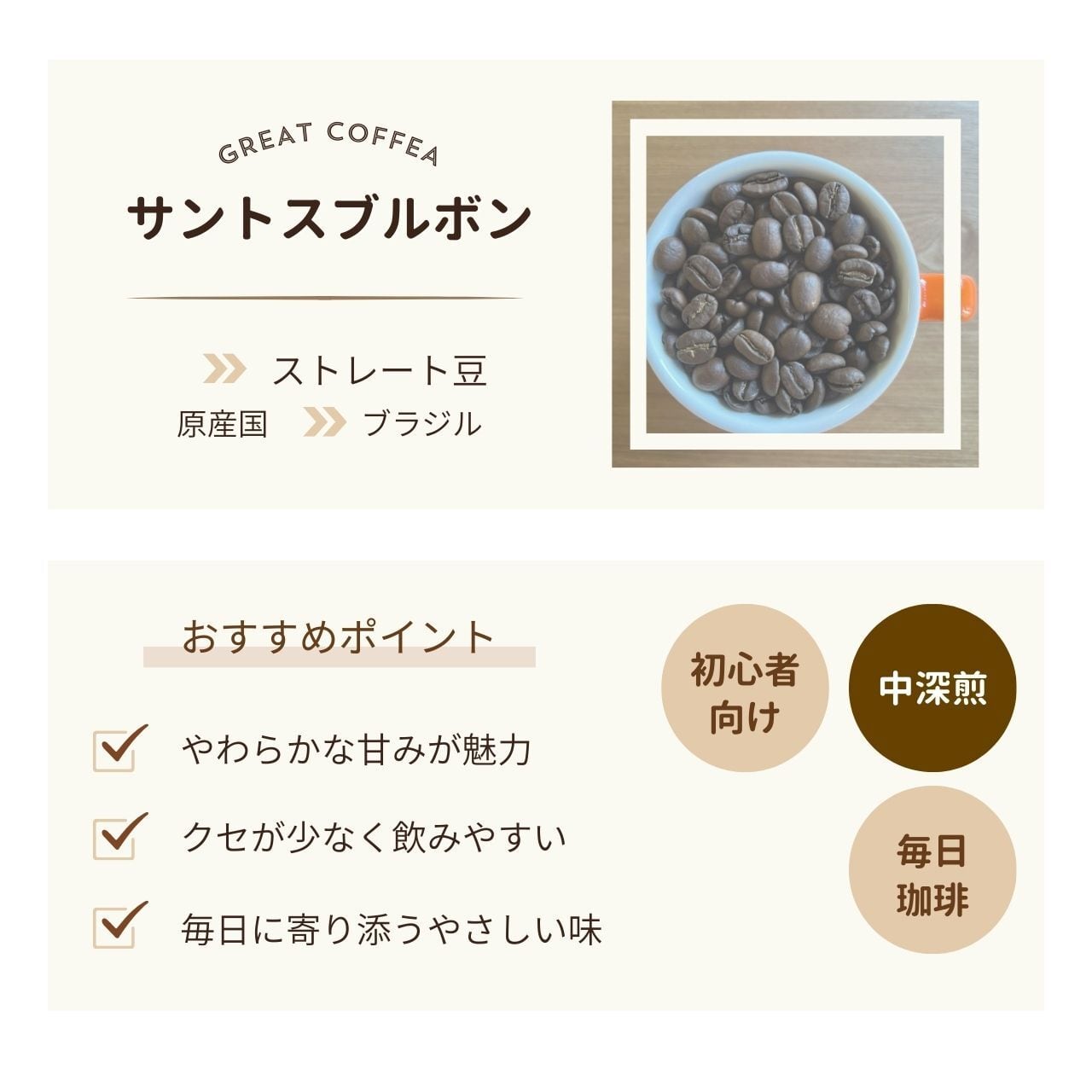 ブラジルらしいあっさりした苦みが好きな方 / ストレート初心者の方 / 毎日飲める豆を探している方におすすめです。