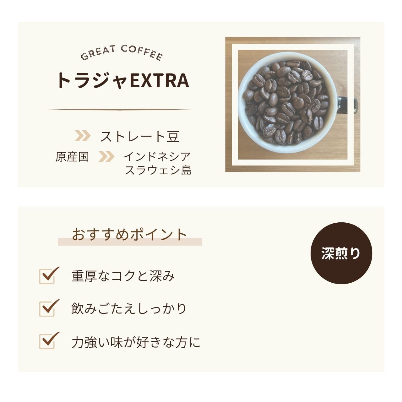 重厚なコクと深みを楽しめる、力強い味わいのトラジャ